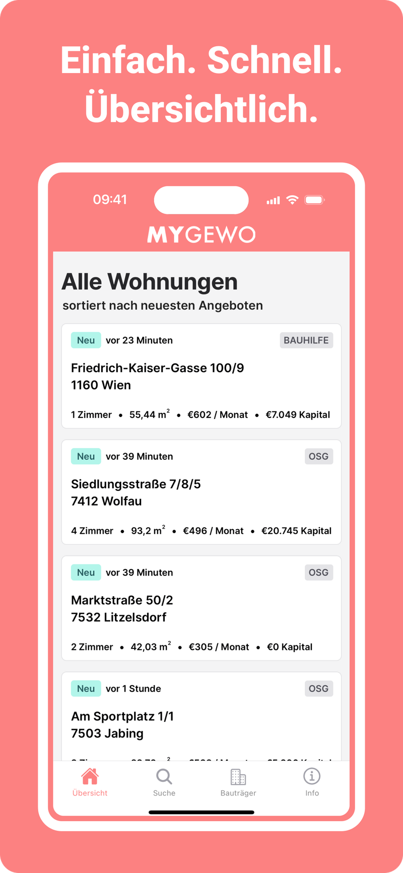 Mit nur einem Tap findest du die neuesten geförderten und gemeinnützigen Wohnungen bzw. Genossenschaftswohnungen.